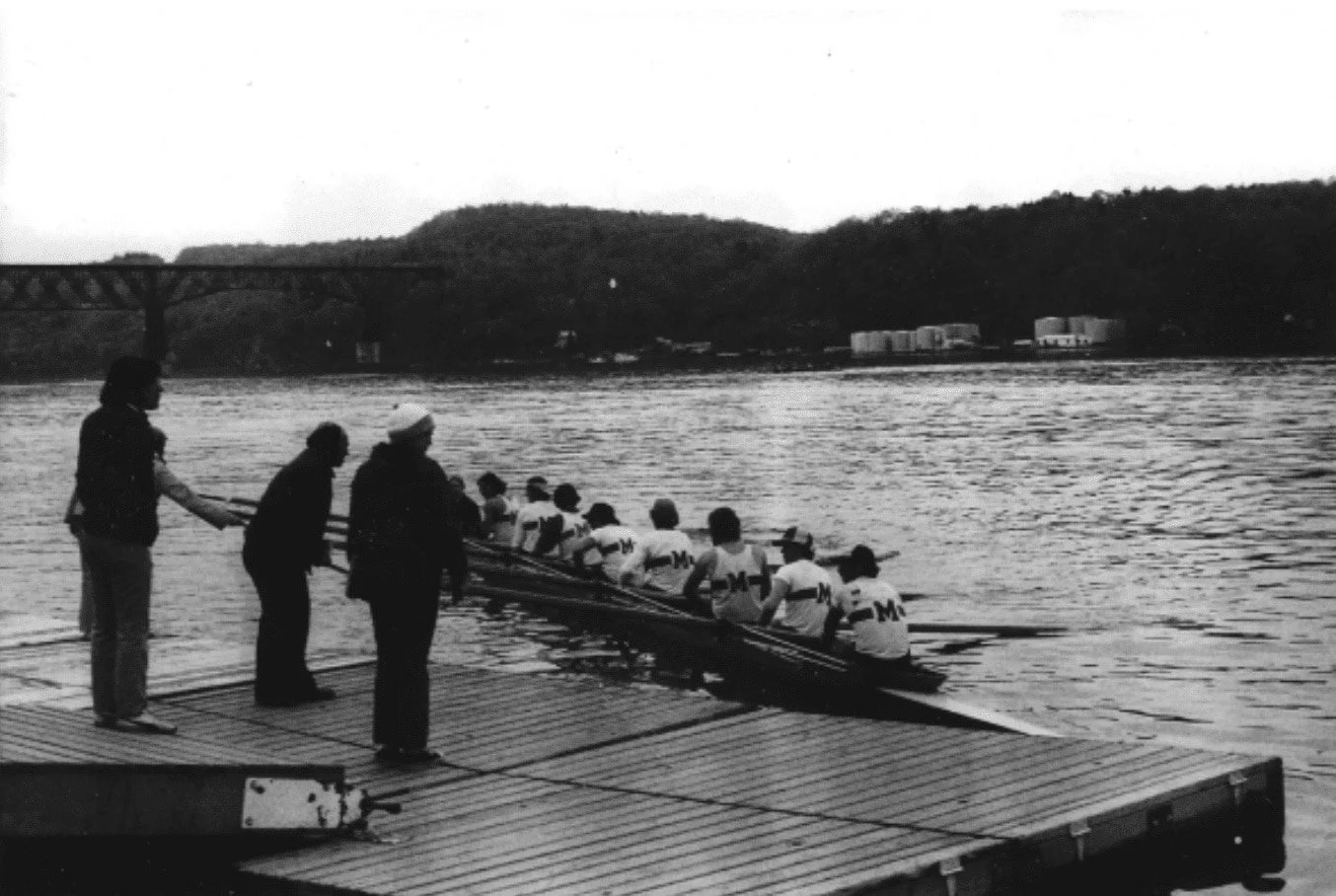 1976 Frosh Heavyweight Eight after defeating Columbia and Georgetown. Head Coach Bill Austin and Frosh Coach Joe McHugh '73 lending assistance on dock.