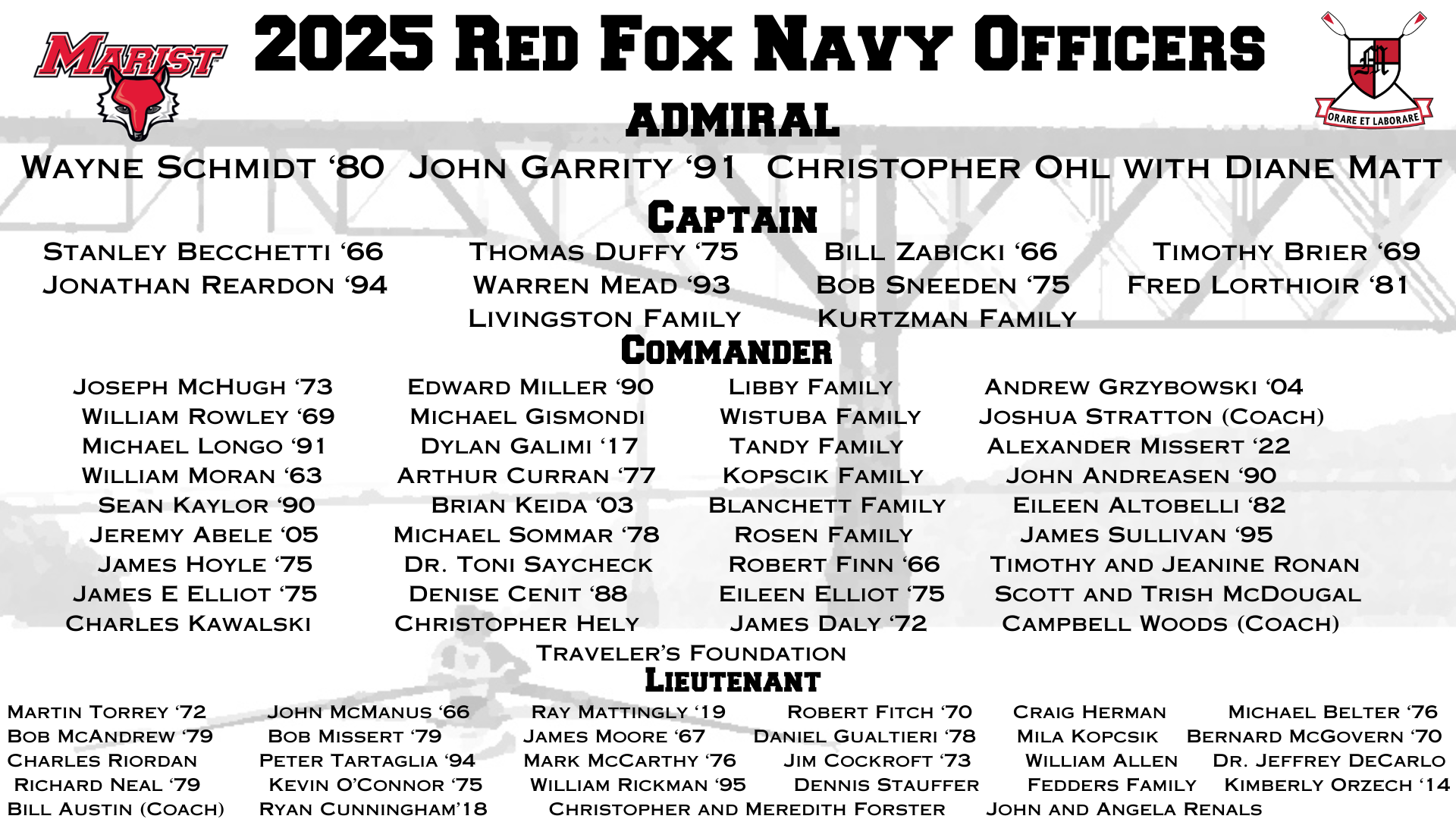 Just like a well honed crew, the best results of fund raising happen when we ALL dip our oar in the water to help, even if that help is just a little bit. The Red Fox Navy is best fueled when we all come together to lend a hand in whatever way we can. We also recognize that our alumni, families and friends, especially the youngest, are often faced with a variety of challenges and must decide where to spend limited resources. In line with these goals, the challenge gift for the Red Fox Navy and our recommended giving levels for each athlete are to give $20 for each year since you’ve graduated up to 15 years or $300. This donation level will earn you a place on the current year list of Red Fox Navy members. Families and friends are invited at a fixed donation of $100 or greater. We hope that you will join us in giving at this base level each year. Your participation, even in the smallest quantities, is an essential piece of our fund raising that makes us stronger as an alumni crew and a family. We also recognize that many of you, after career and family success, have funding available to support our efforts in greater quantities. We continue to be incredibly grateful to the fantastic alumni and families that go above and beyond the RFN base membership level and to honor their commitment we have established several Red Fox Navy ranks. Donations at these higher levels will earn you recognition amongst your peers and more prominent presentation on our RFN website as well as at the Boat House!